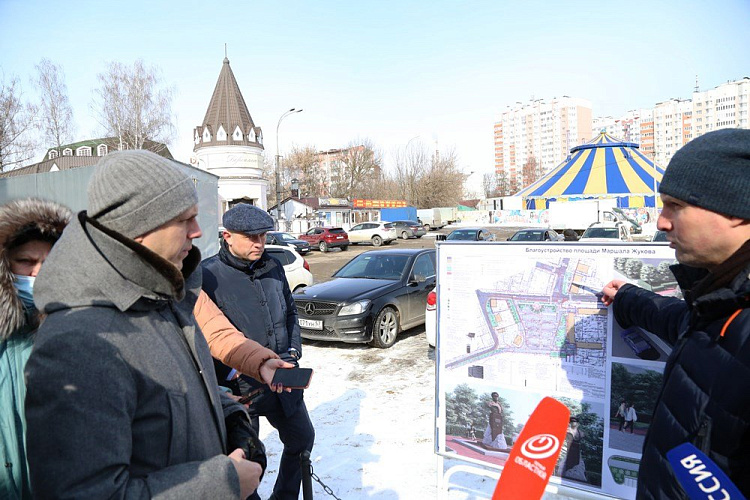 В рамках благоустройства будет выполнено плиточное мощение тротуаров и самой площади с применением плитки, рассчитанной на проезд автотранспорта, установка бюста Г.К. Жукову, а также освещение, озеленение и установка малых архитектурных форм.