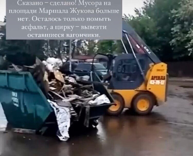 На кадрах, снятых мэром Орла, виден процесс уборки площади. Переполненный отходами контейнер, фрагменты мусора на асфальте и вагончики артистов – всё, что осталось от цирка.